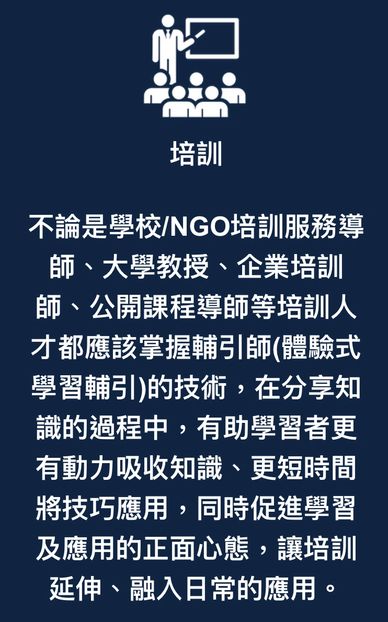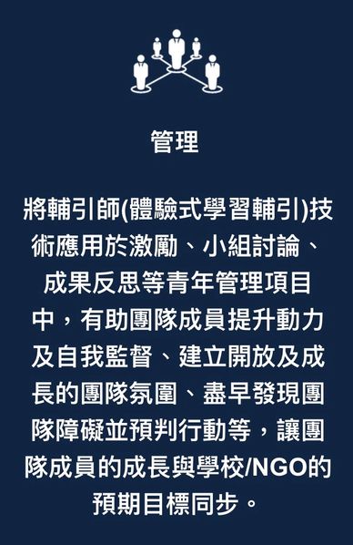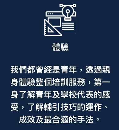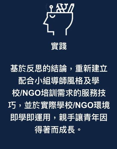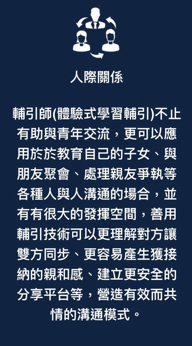 體驗式學習配合輔引學的系統式體驗及實踐,可以成就各種培訓服務導師的所需技能,孕育更多學校、NGO或機構真正需要的「讓青年多元成長的導師」。