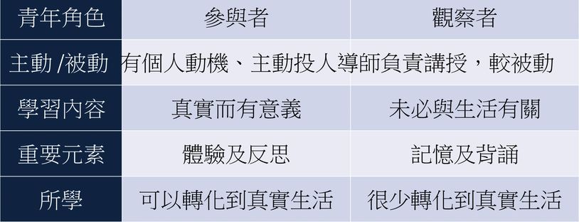 根據體驗式學習活動成效研究的發現,體驗式學習活動讓青年「誘發對不同文化的學習動機和好奇心」、「有更大誘因和動力持續發展和學習」及「建立對人的尊重和同理心」。(葉蔭榮、馮智、朱勉,2019)